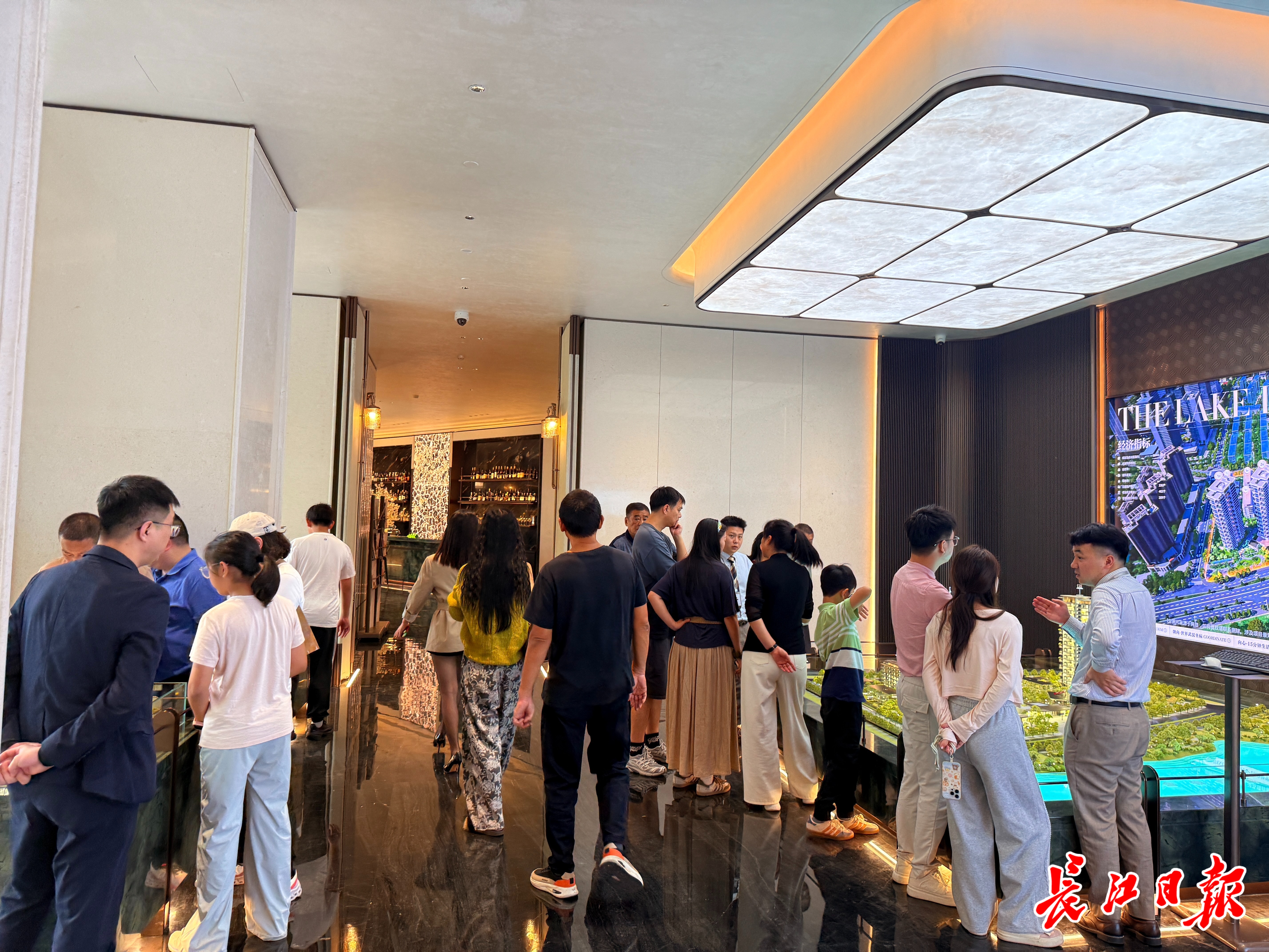 记者上午参观位于汉口金银湖畔的莲花诞生湖地产项目时20日,接待区挤满了几十张沙发,销售顾问在顾客中间奔跑。行政酒廊的水吧也挤满了人。